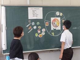 栄養のバランスを考えたメニュー作りを行いました。子供たちは、グループで話したり、全体で話したりと楽しく活動していました。