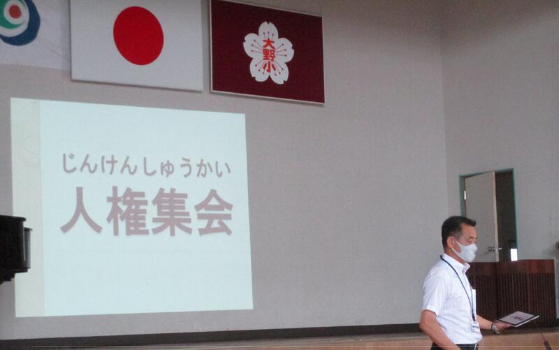 人権集会の最後は、教頭先生のお話でした。これまで指導されてきた時の作文を読まれて、みんなが笑顔で頑張れるようにしていくことを話されました。