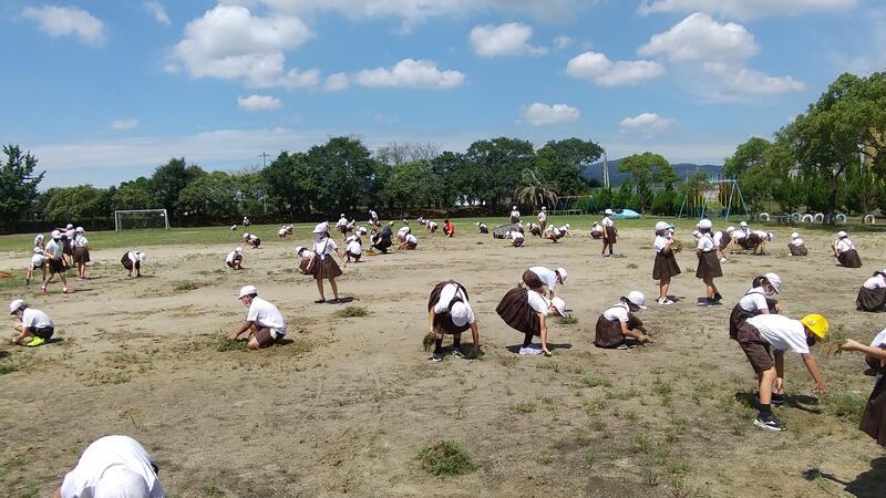 夏休み期間中は、大雨や長雨が続き、大野小学校の運動場は草がたくさん生えていました。