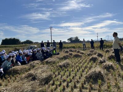 橋本大野支館長様にお話をいただいた後、柴尾PTA会長様にわらの束ね方を教えていただきました。その後、子供たちは、応援で参加してくださった区長様にも教えていただきながら、2人組になって手際よくわらを集め、ひもで束ねることができていました。
