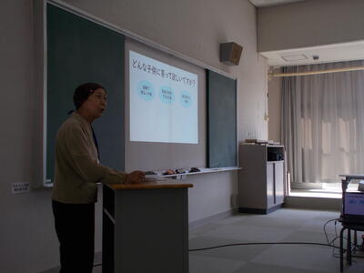 保護者説明会では、学校から入学に向けての準備について説明を行った後、今年度は、熊本県教育委員会から幼児教育スーパーバイザーの岡嶋滋子先生に来校いただき、「入学を前にした家庭の役割」についてご講話いただきました。保護者の方々も家庭教育の重要性を再確認しながら、真剣に聞かれていました。