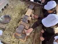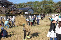 橋本大野支館長様にお話をいただいた後、柴尾PTA会長様にわらの束ね方を教えていただきました。その後、子供たちは、応援で参加してくださった区長様にも教えていただきながら、2人組になって手際よくわらを集め、ひもで束ねることができていました。