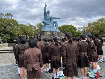 1日目は、平和公園で平和集会を行い、その後、長崎市内のフィールドワークや原爆資料館の見学等、実際に目や耳で学ぶことを通して、学校で事前学習していたことを、さらに深めることができたようです。「二度と戦争をしないこと」「平和な世の中を築いていくこと」を心に誓った日にもなりました。