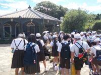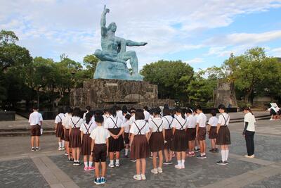 1日目は、平和学習を行いました。まず、長崎平和推進協会の八木道子さんの被爆体験講話を聞き、その後、原爆資料館を見学しました。講話では、戦争や原爆の恐ろしさ、愚かさ、今後、世界から戦争をなくし、平和な世の中をつくるバトンを受け継いでほしいという願いで、本当に子供たちに語りかけるように熱心にお話いただきました。子供たちの心にも響いた様子で、原爆資料館の見学、午後からのフィールドワークも真剣にガイドさんの話を聞いていました。1日目の最後に学んだことをもとに、平和祈念像の前で平和集会を行い、これからの自分たちの平和を守るための行動を誓いました。