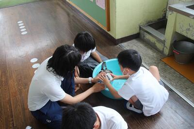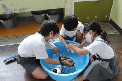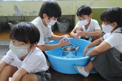 4つの班に分かれて友達と協力しながら行いました。空の牛乳パックにも水を入れて、2dLを量っていました。水の心地よさを含めてかさについて感触を確かめていました。