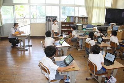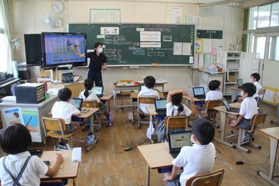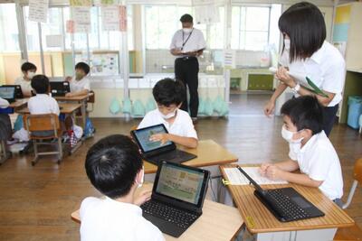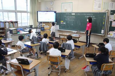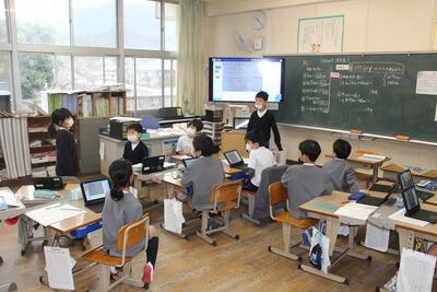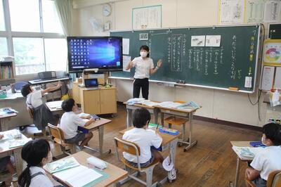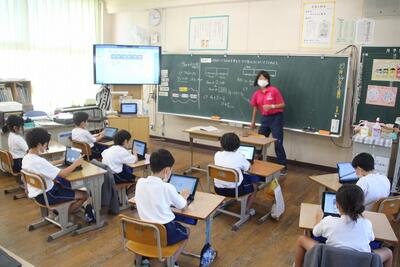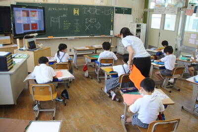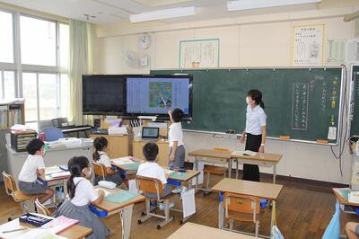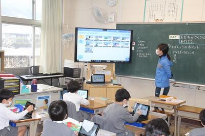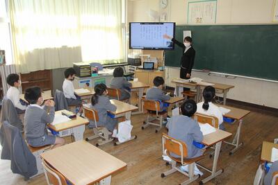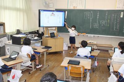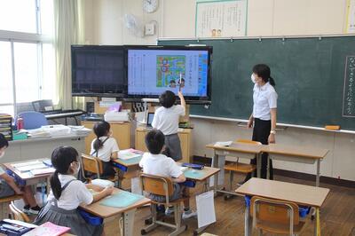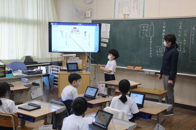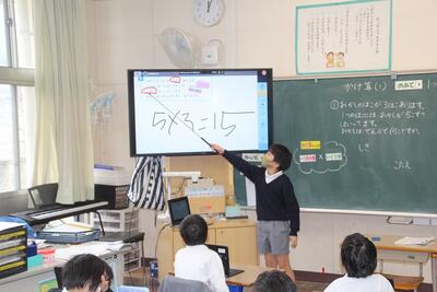 新しく習う漢字の学習の場面です。ある児童が先生用のタブレットを操作して、「算」の書き順の動画を流し、それにあわせて周りの児童が書き順を確かめていました。子どもから子どもへつながる学習を展開中です。