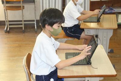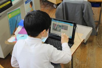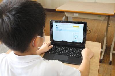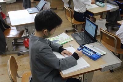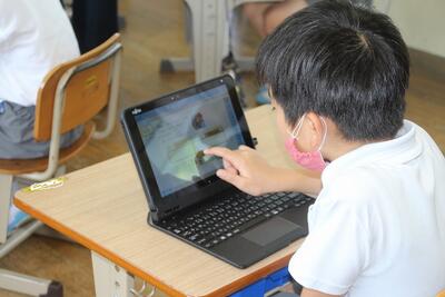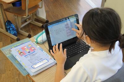 算数科では、2桁たす2桁のたし算の筆算の学習のまとめをしています。ノートでの問題を解き終わったら、タブレット端末を使ってe-ライブラリーの問題をしました。答え合わせを自動でやってくれるので、一人で集中して問題に向き合うことができます。