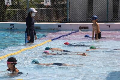 夏空が広がり、プールでの運動は最適です。動物になりきって、顔をつけたり潜ったり水に浮いたりなどの運動をしました。