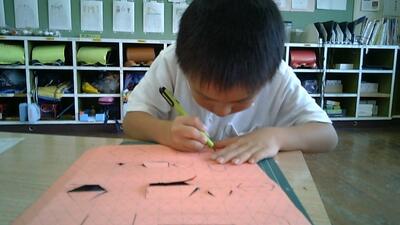 図工科では、「まどからこんにちは」という題材を学習しています。先日、カッターナイフを使う2年生を紹介しました。その続編です。