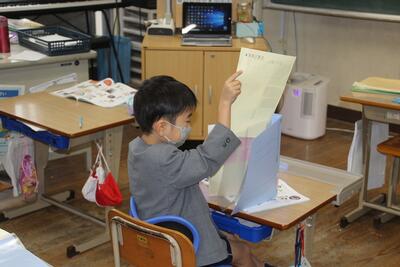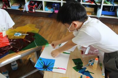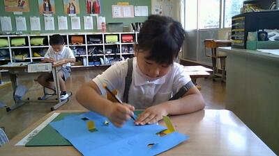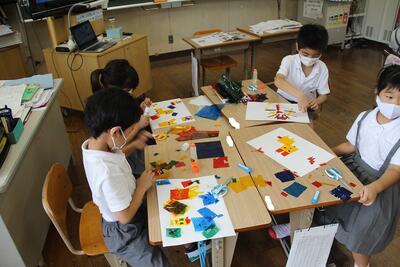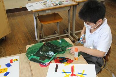 図工科では、色のついたセロファン紙を重ねて色や形を作り出す学習を行いました。セロファン紙をはさみで切って、自分がイメージしたものを表現しました。はさみの使い方やのりの付け方がとても上手になりました。もちろん後片付けも上手になりました。