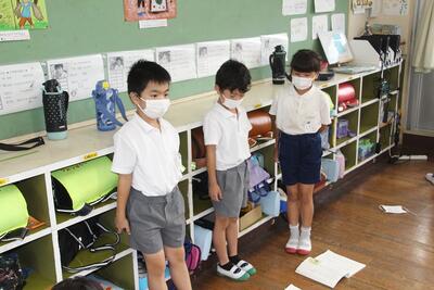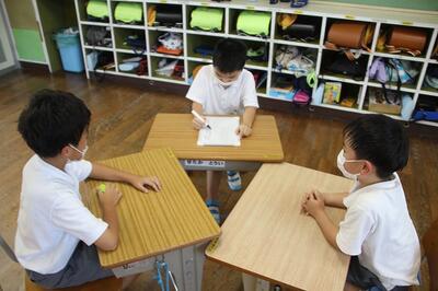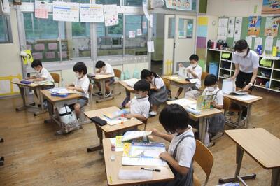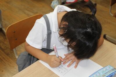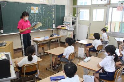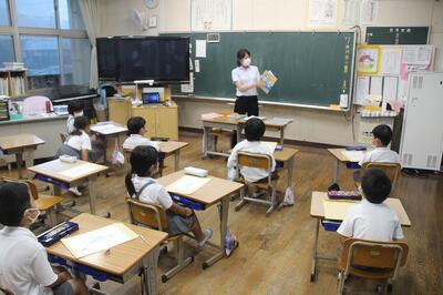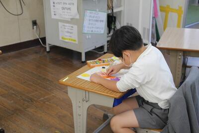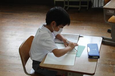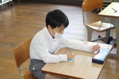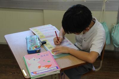 この日は、夏休み前に夏休みの宿題が配られました。ドリル集にネームペンで名前を書いたり、付属の一行日記のプリントには鉛筆で名前を書いたりしました。