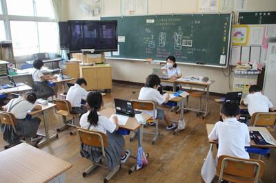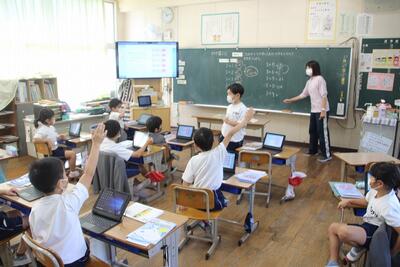 その後、みんなで考えを共有しました。タブレットやモニターなどに接続できるので、友達の考えを理解しやすくなります。授業の終わりには、学習の振り返りをしました。テープ図のよさについて発表していました。
