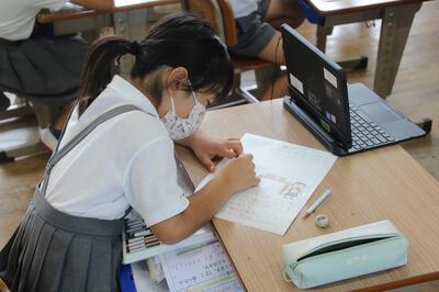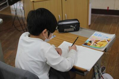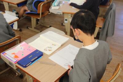 国語科では、モンゴルの民話「スーホの白い馬」を使って、読んで感じたことを伝え合う学習をしてきました。この日は、自分で選んだ世界の民話を紹介する文を書きました。登場人物の行動や会話などから、強く心を動かされた点を中心に根拠や理由を紹介しています。この紹介文が他の学年の人たちの読書に役立てば学習のかいがあります。