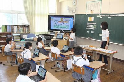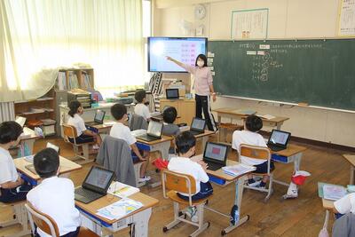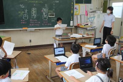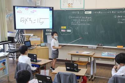 算数科では、かけ算の学習に入ります。この日は基準量のいくつ分になるかを考え、かけ算を使う場面について理解していきました。タブレットに自分の考えを書き込み、ペアで考えを伝え合いました。これから九九を学習します。