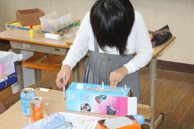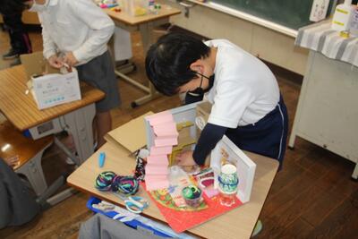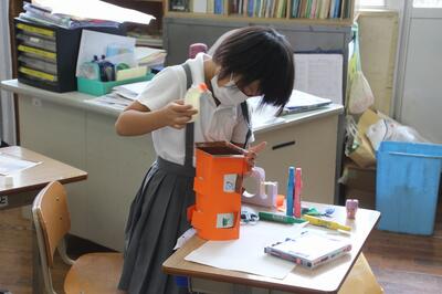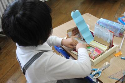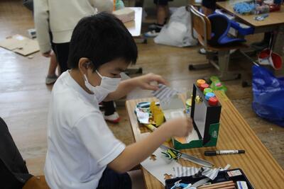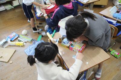 図工科では、空き箱や身近な材料を使って「小さな友だち」の喜ぶ家を考え,いろいろな形や色などを捉えながら,表し方を工夫して表す学習をしました。小さな友だちが喜ぶ家を夢中になって作っていました。