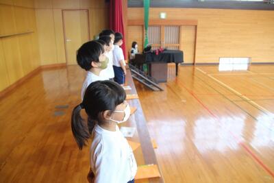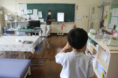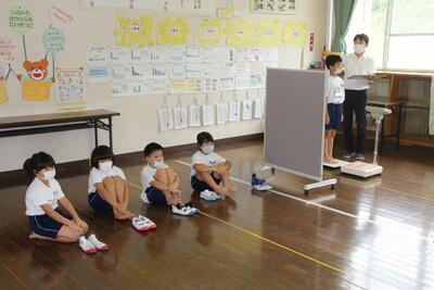 身体測定と視力検査を行いました。身長・体重を測るグループと視力検査をするグループに分かれて行いました。自分の番が来るまで静かに待つことができました。全員が終わったら教室に帰り、養護教諭から保健指導がありました。メディア使用による体への影響やノーメディアデーの取組などについての話がありました。