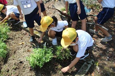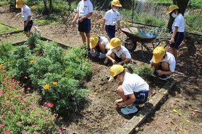 生活科の学習で、学級園の草取りをしました。夏休みの愛校作業の時にする予定でしたが、雨のため中止になってしまい、雑草がたくさん生長していたした。残暑が厳しい気候ですが、2年生はみんなで協力して最後まで丁寧に雑草を抜いていました。学級園の花たちが気持ちよさそうです。