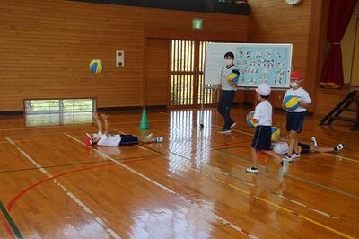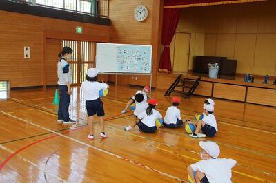 体育科の学習では、多様な動きをつくる運動遊びを行いました。この運動遊びには、体のバランスをとる・体を移動する・用具を操作する・力試しの4つから構成されています。今回は、用具(ボール)を操作する運動遊びでした。ボールを投げる・捕る・つく・運ぶなどを体勢や部位を変化させて運動しました。おなかの上に乗せて運んだり、二人でおなかにはさんで運んだりして楽しそうに活動していました。