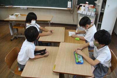 国語科では、「だいじなことばに気をつけて読み、分かったことを知らせよう」という学習をしています。教材文「おにごっこ」を読み、説明の仕方を理解します。その後、自分で調べた遊びなどを説明する活動を行います。