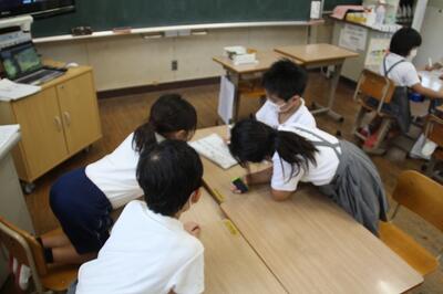 生活科では、先日行った町探検のまとめをしていました。見学したところを子どもたちで分担して、広用紙にカードを貼っていきました。ステキな地図ができあがりそうです。