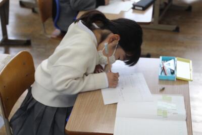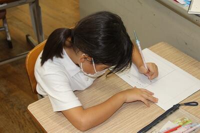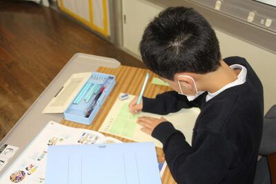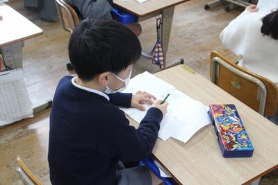 算数科では「三角形と四角形」という単元の学習が終わりました。ひとつの単元が終わると、だいたいテストが行われます。この日のテストでは、三角形や四角形のこと、辺や頂点、直角・正方形や長方形などの問いがありました。問題をよく読んで答えていました。