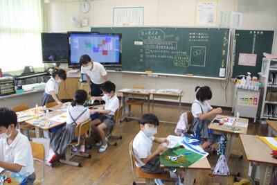 図工科では、版画の学習をしています。この日は、型紙で色づけした主になるものの背景を自分なりに工夫する学習でした。スポンジに色を付けペタペタはんこを押すように色を塗って、海や空などの様子を表現していました。