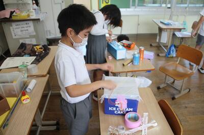 図工科では、「音づくりフレンズ」という単元で、身近な物で楽器を作る学習を行いました。ゴムを活用して弦楽器を、空き缶やペットボトルを活用して打楽器などを作っていました。発想豊かに創作活動をする東陽っ子2年生です。