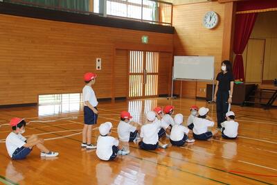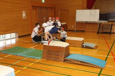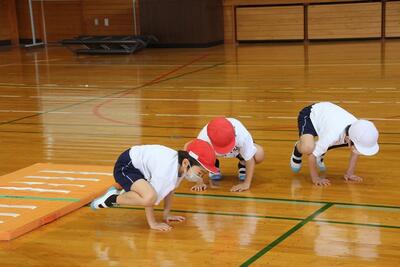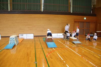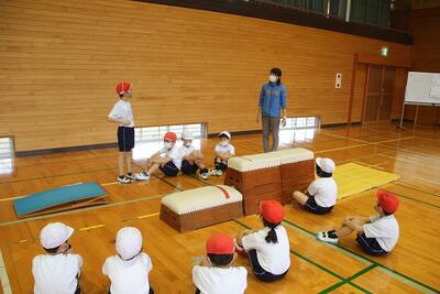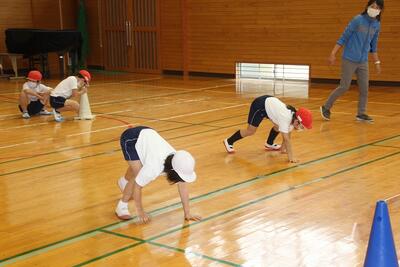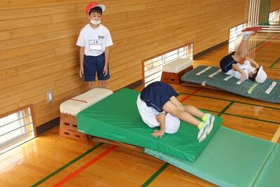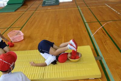 体育科ではマット遊びをしています。準備運動や補助運動の後、この日は後ろ転がりの練習をしました。赤玉を足ではさみボールの中に入れるゲームをして、後ろころがりの動きになれる運動を行いました。その後、坂道や段差・ゴム紐をはった場などで後ろ転がりの動きを楽しむました。