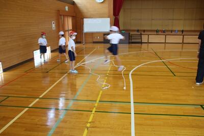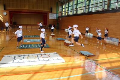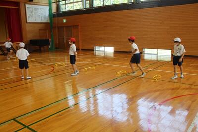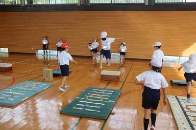 体育科では、走・跳の運動遊びを行っています。この日は、ケンステップ(丸い輪)やミニハードル、長い縄などを使って、片足でステップしたり、跳んだり、走り抜けたりする運動遊びをしました。置き方を変えて場を工夫したり、ジャンプにひねりを付け加えたりなど動きを工夫したりして、楽しんでいました。