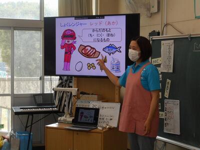 栄養教諭のM先生が食育の授業をしてくれました。赤・黄・緑の食品群とその働きについて学習しました。「食レンジャー レッド・イエロー・グリーン」が登場し、子どもたちは引き込まれていきました。バランスよく食べることが大切だと分かった東陽っ子2年生です。