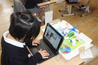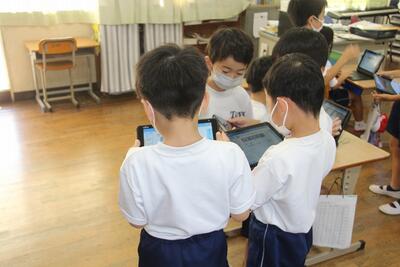 体育科では、とびばこ運動遊びを行いました。この日は、いろいろな跳び方でとびばこを跳ぶ活動を行いました。自分やともだちの動きが分かるように、タブレットPCで撮影しました。動きの確認や変化を見て学ぶことができます。