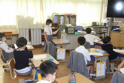 算数科では、かけ算を学習しています。この日は、「一つ分の数」と「いくつ分」について考える学習でした。文章問題に初めて「いくつ分」が先に出てきて「一つ分の数」が後に出てくるという問いでした。子どもたちはよく見分けて答えていました。