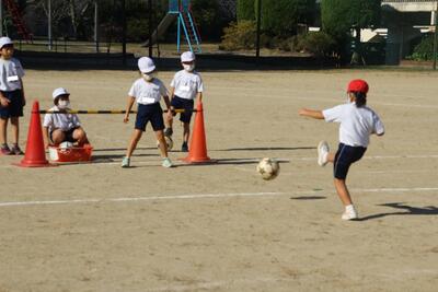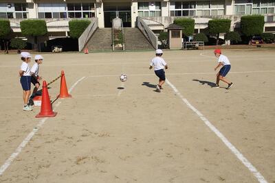 体育科では、ボールゲーム「キックベースボール」の学習をしています。ボールのけり方やとり方などの個人技や、守り方や得点の仕方などのチームプレーなどを考えながら活動しています。ベースの代わりにコーンを回って得点化したり、ボールをとった人の周りに集まってアウトにしたりなど、ルールの工夫を行っています。ボールを力一杯ける子どもたちの姿がかっこよかったです。