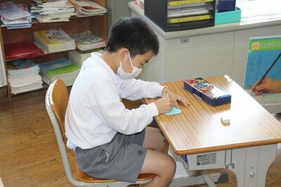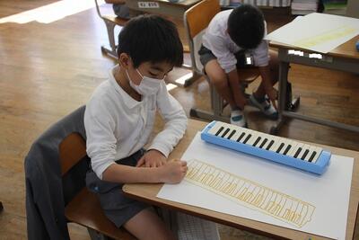 音楽科では、「山のポルカ」の合奏のために、鍵盤ハーモニカを練習していました。八分音符のリズムに合わせて、指を一生懸命動かしていました。図工の作品とつながっていますね。