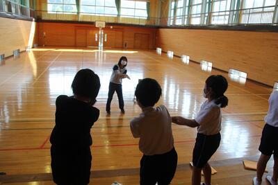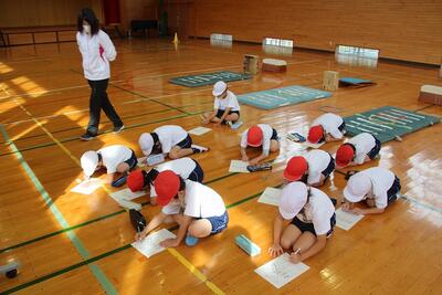 体育科では、はばとび運動遊びを行いました。ねらったサークルに着地して得点して、チームの合計得点で競い合うゲームをしてはばとび運動遊びを楽しみました。サークルから1歩より多くはみ出したら得点がなしになるので、着地の仕方を考えながら動きました。着地のコツをつかんだ児童は得点をコツコツ積み上げていきました。振り返りをして、自分ののびや友達のよかった点を発表しました。