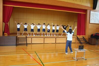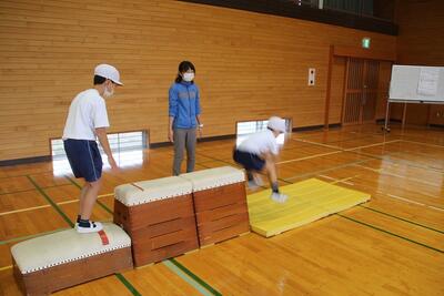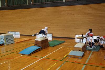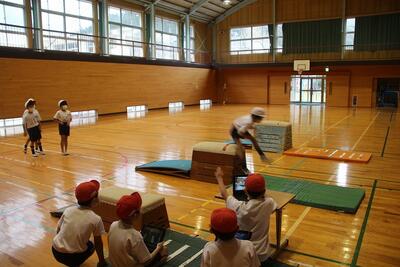 体育科ではとびばこ運動遊びを行いました。まず、動物の動きのまねをして、自分の腕を使って体を支える動きづくりをしました。次に、跳び箱を縦に並べて、いろいろな動きづくりをしました。ジャンプをしたり開脚跳びをしたりして、楽しんでいました。最後に、動きのよかった人を見つけて、伝え合っていました。