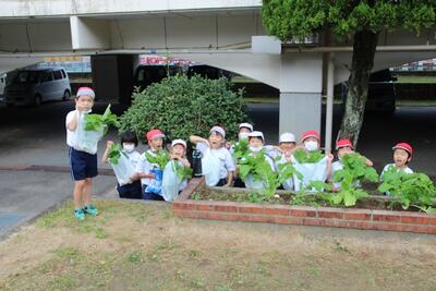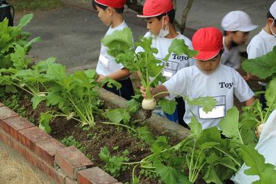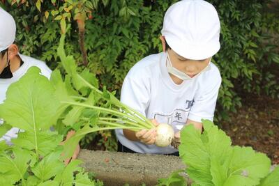 生活科では、学級園で育てていたかぶを収穫しました。土の中から白いかぶが現れると、子どもたちから歓声が上がりました。一人3個くらい持ち帰ることができ、夕飯の材料になったことでしょう。