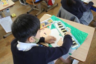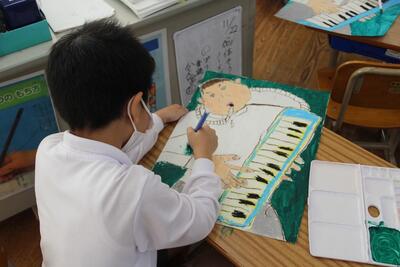 図工科では、けんばんハーモニカをひく自分を絵に表しています。人やけんばんはクレパスで、背景は絵の具で塗りました。今にも動き出しそうな作品を仕上げました。教室の後方に掲示しています。