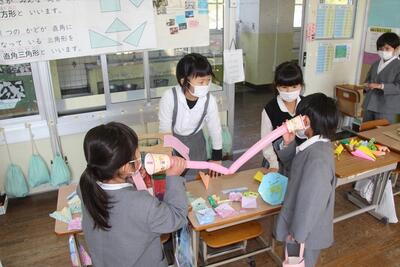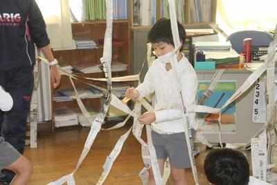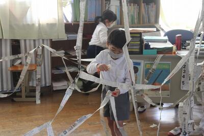 図工科では「つないでつるして」という学習を行いました。新聞紙を細長く切ったものをのりなどでつないで、新しい形が生まれる喜びや、友達と協働するよさを実感する活動です。教室の中が非日常的な空間になり、この雰囲気を楽しんでいました。