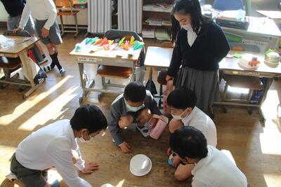 図工科では、ストローを組み合わせて作った動く仕組みから表したいことを考え、色や形・材料を工夫して表す学習をしています。子どもたちは昆虫や動物をイメージして、作品を作っていました。どんな動きをするのかとても楽しみです。