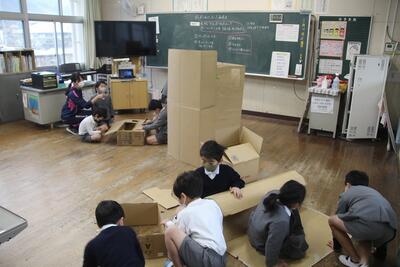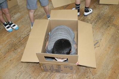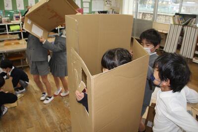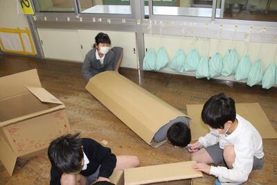 図工科では、「だんボールに入ってみると」という学習をしました。段ボール箱の中に入り、大きさを味わい、形を変えたり、友達と協力したりしながら、形にしていく活動でした。折ったり切ったりしながら、生き生きと活動する2年生でした。
