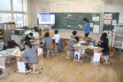 算数科の授業では、テープ図を使って問題を解いていく学習でした。タブレットの中にある発表ノートに自分の考えを記入していきました。