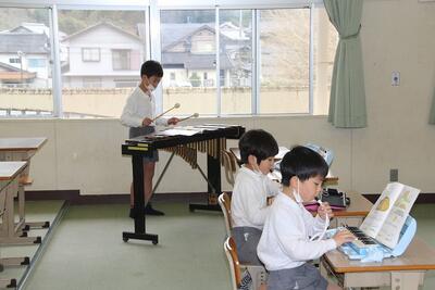 音楽科では、「みんなであわせて楽しもう」という学習をしています。この日は、「うたごえとがっきの音をあわせてえんそうしよう」ということで、「こぐまの二月」という曲を使って、けんばんハーモニカ・鉄琴・バスマスターなどで合奏をしました。みんなの音を合わせる心地よさを体験しています。