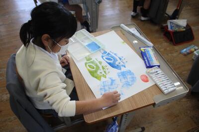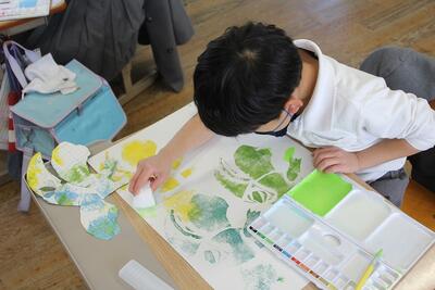 図工科では、版画の学習をしています。この日は、型紙で色づけした主になるものの背景を自分なりに工夫する学習でした。スポンジに色を付けペタペタはんこを押すように色を塗って、海や空などの様子を表現していました。