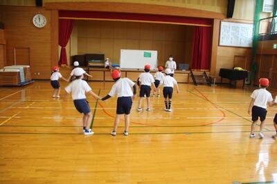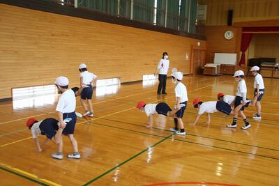 体くり運動遊びを学習しています。この日は、まねっこマラソンや手押し車、二人組で同調する動き、柔らかい動きなど、多様な動きをつくる運動遊びを行いました。2年生の笑顔がはじけていました。