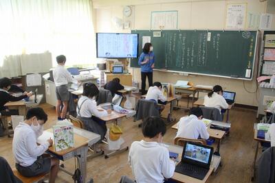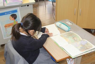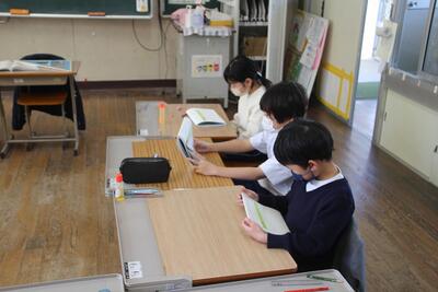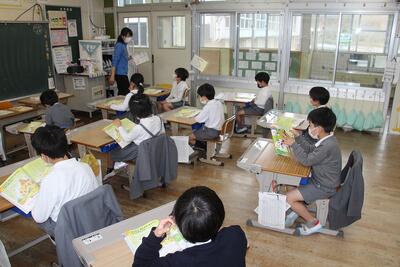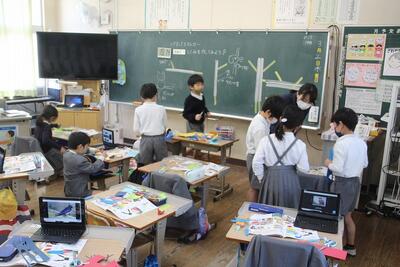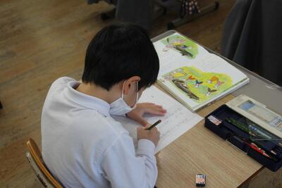 国語科では、モンゴルの民話「スーホの白い馬」を使って、読んで感じたことを伝え合う学習をしてきました。この日は、自分で選んだ世界の民話を紹介する文を書きました。登場人物の行動や会話などから、強く心を動かされた点を中心に根拠や理由を紹介しています。この紹介文が他の学年の人たちの読書に役立てば学習のかいがあります。