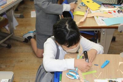 図工科では、ストローを組み合わせて作った動く仕組みから表したいことを考え、色や形・材料を工夫して表す学習をしています。子どもたちは昆虫や動物をイメージして、作品を作っていました。どんな動きをするのかとても楽しみです。