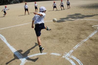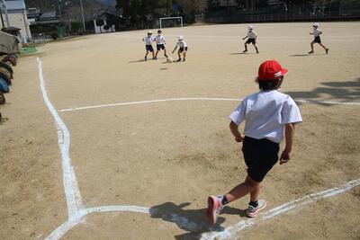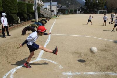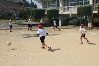 体育科では、ボールゲーム「キックベースボール」の学習をしています。ボールのけり方やとり方などの個人技や、守り方や得点の仕方などのチームプレーなどを考えながら活動しています。ベースの代わりにコーンを回って得点化したり、ボールをとった人の周りに集まってアウトにしたりなど、ルールの工夫を行っています。ボールを力一杯ける子どもたちの姿がかっこよかったです。