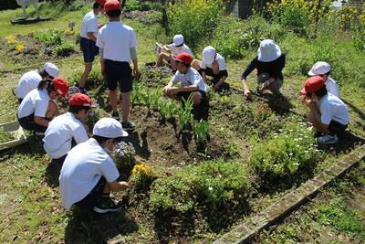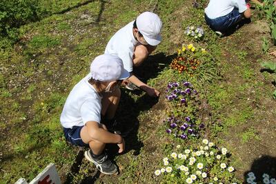 春の陽気に包まれて植物たちの活動が活発になります。学級園の草花がよく育つように、雑草を取り除きました。みんなで力を合わせて、学級園の雑草をきれいに抜いてくれました。春の光が学級園の草花や2年生を輝かせてくれました。