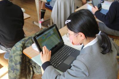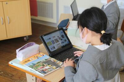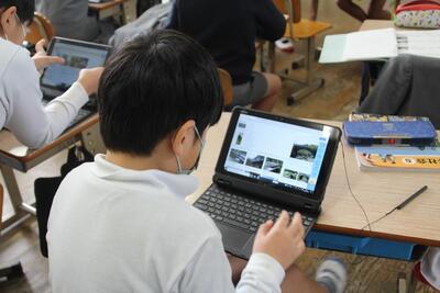 社会科では、かわる道具とくらしについて学習しています。この日は、昔の道具についてインターネットで調べて、学習カードにまとめていました。今と昔の道具を比較して、人々の生活の移り変わりや自分たちの生活について考えていきます。